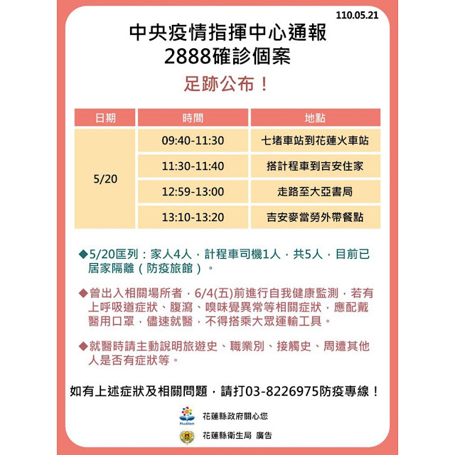 搭火車至花蓮確診者足跡公布 #案2888 #18日下午萬芳醫院採檢 #20日搭火車返家至花蓮吉安鄉 #下火車至吉安大亞書局 #再騎機車去吉安麥當勞買中餐 #因非居家隔離者所以無罰責 #請曾經接觸相關場所地點者自主健康管理至6月4日 Am730香港公信力第一的免費報紙 新聞 33日零本地個案斷纜 男搬運確診帶l452r 強檢約8萬機場員工 新型肺炎,機場,強制檢測,黃大仙,搬運工,源頭不明,新. 桃園市 / 黃品瑄 薛松乾 吳權原 報導.